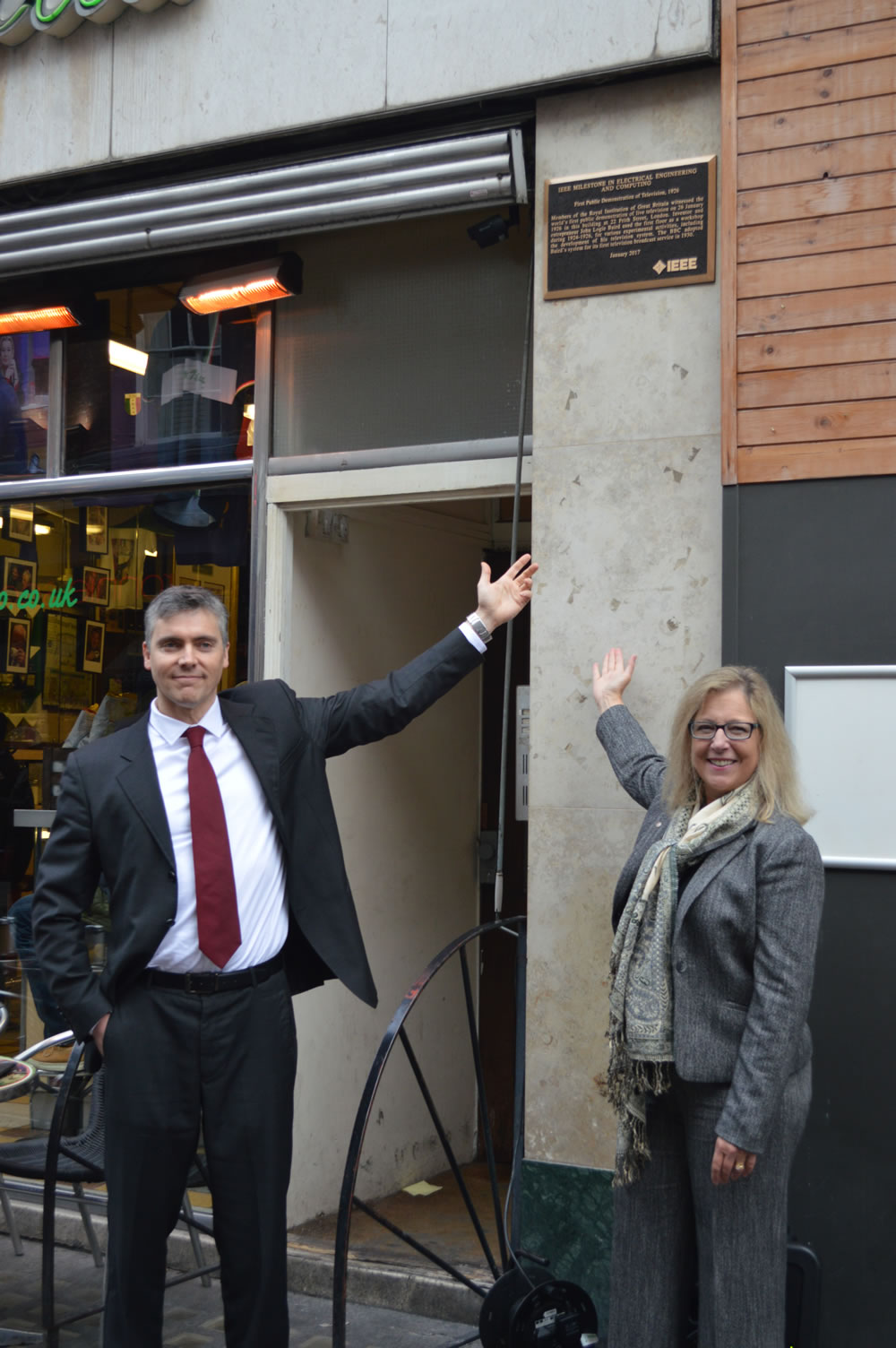 The plaque is installed at Bar-Italia, Frith Street, Soho, London and was unveiled on 26th January 2017, by IEEE President Karen Bartleson and Iain Logie Baird, a grandson of John Logie Baird.