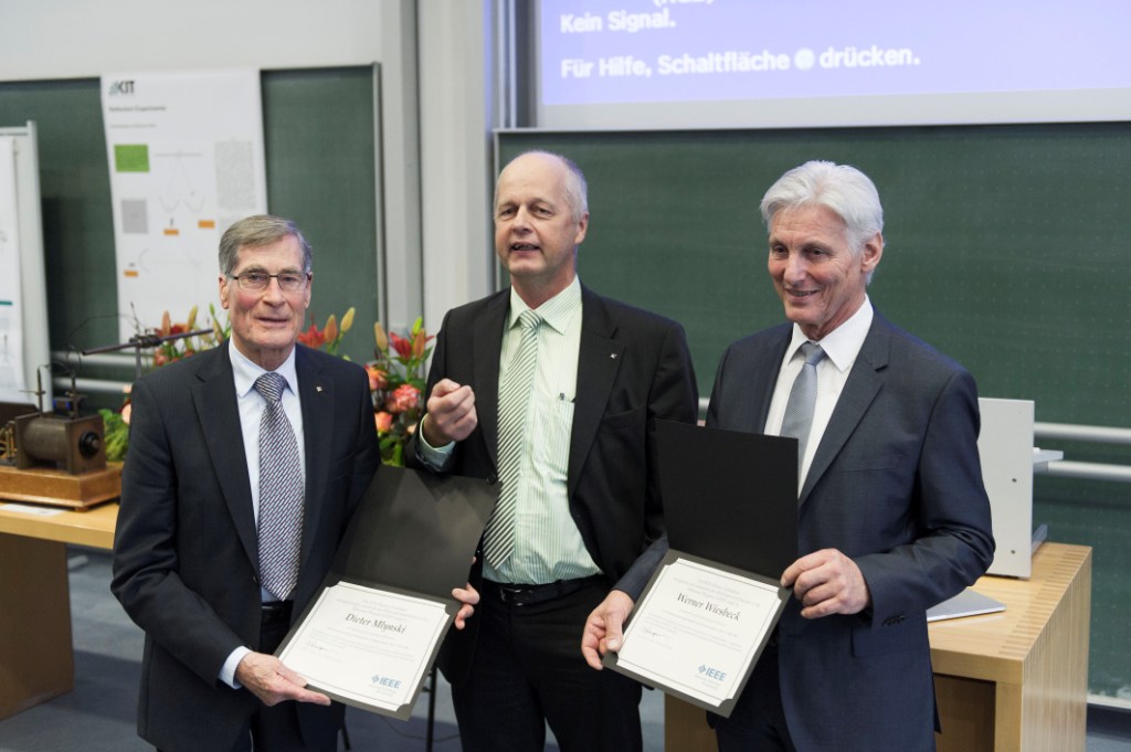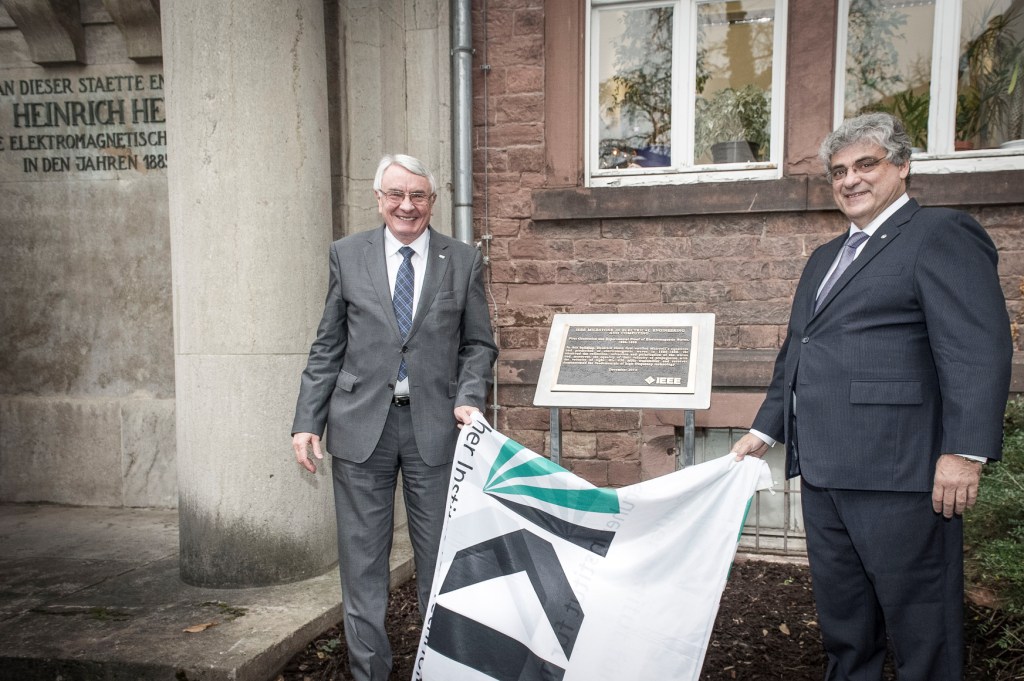The Milestone plaque is at the original site of Hertz’s experiments. On Friday 5th December 2014, IEEE President Roberto de Marca and KIT Vice President Detlef Löhe unveiled the plaque. The host, Dean of the Department of Electrical Engineering and Information Technology Thomas Leibfried, welcomed the numerous attendees, which included Region 8 Director Martin Bastiaans, Germany Section Chair Axel Richter and the Milestone nominators Dieter A. Mlynski, IEEE Life Fellow from Circuits and Systems Society, and Werner Wiesbeck, IEEE Life Fellow from Microwave Theory and Techniques Society.