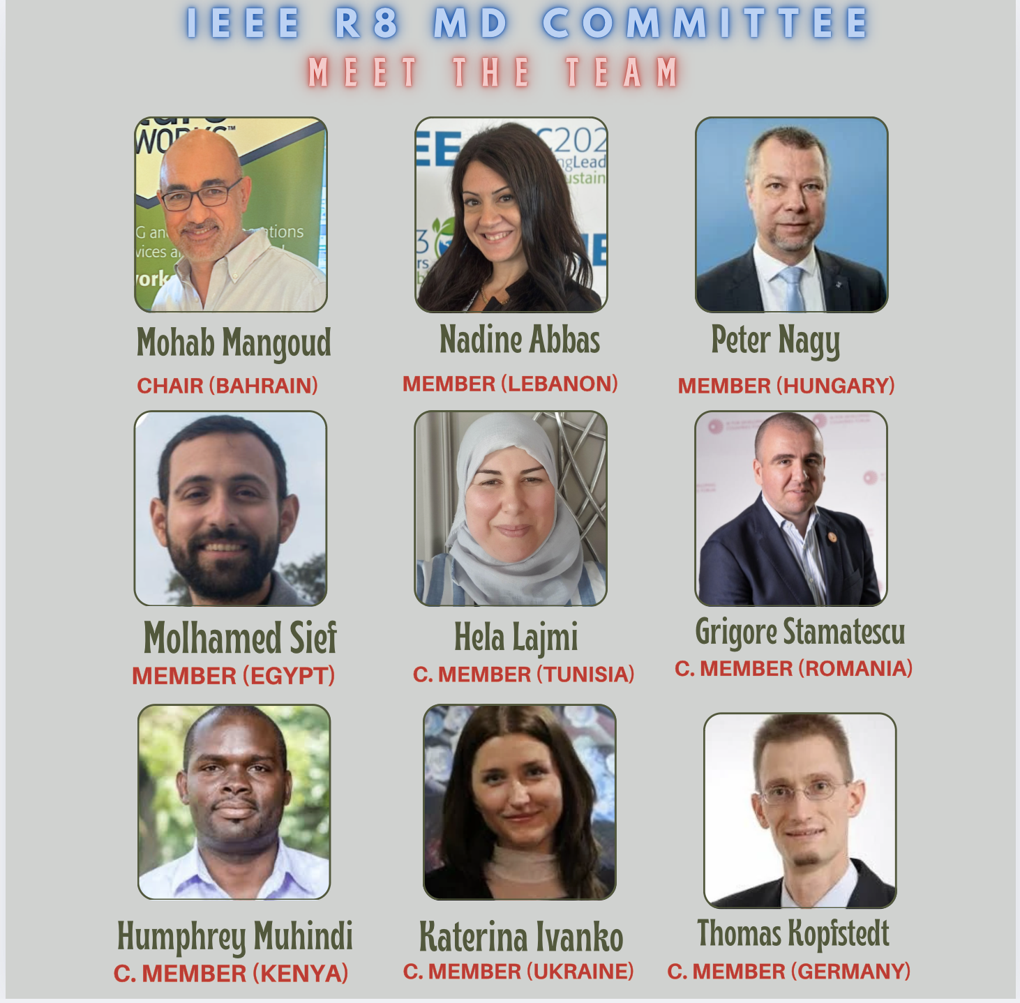 IEEE R8 Membership Development Committee (2025)Mohab Mangoud (Bahrain), (Chair)Peter Nagy (Hungary), (Member)Nadine Abbas (Lebanon), (Member)Mohamed Sief (Egypt), (Member)Grigore Stamatescu (Romania), (C-Member)Hela Lajmi (Tunisia), (C-Member)Humphrey Muhindi (Kenya), (C-Member)Katerina Ivanko(Ukraine), (C-Member)Thomas Kopfstedt (Germany), (C-Member)
